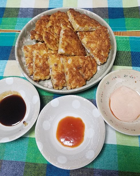 アジチヂミです😃ピザソース、オーロラソース、中濃ソース、オーロラソースが一番好きでした(笑)