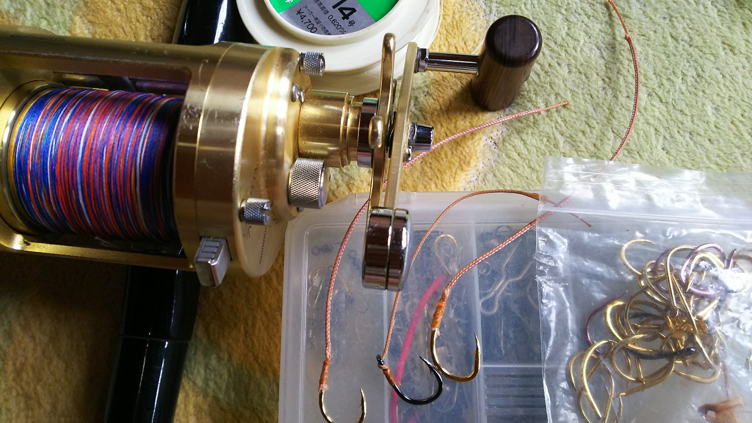 今回は台風で釣り出来るか分からなかったので狙いを決め竿2本、PE8号と16号、ハリス14号と10号、捨て糸5号、ハリもデカイサイズ、餌はイカとカニのブッコミ道具しか持ってきていません。