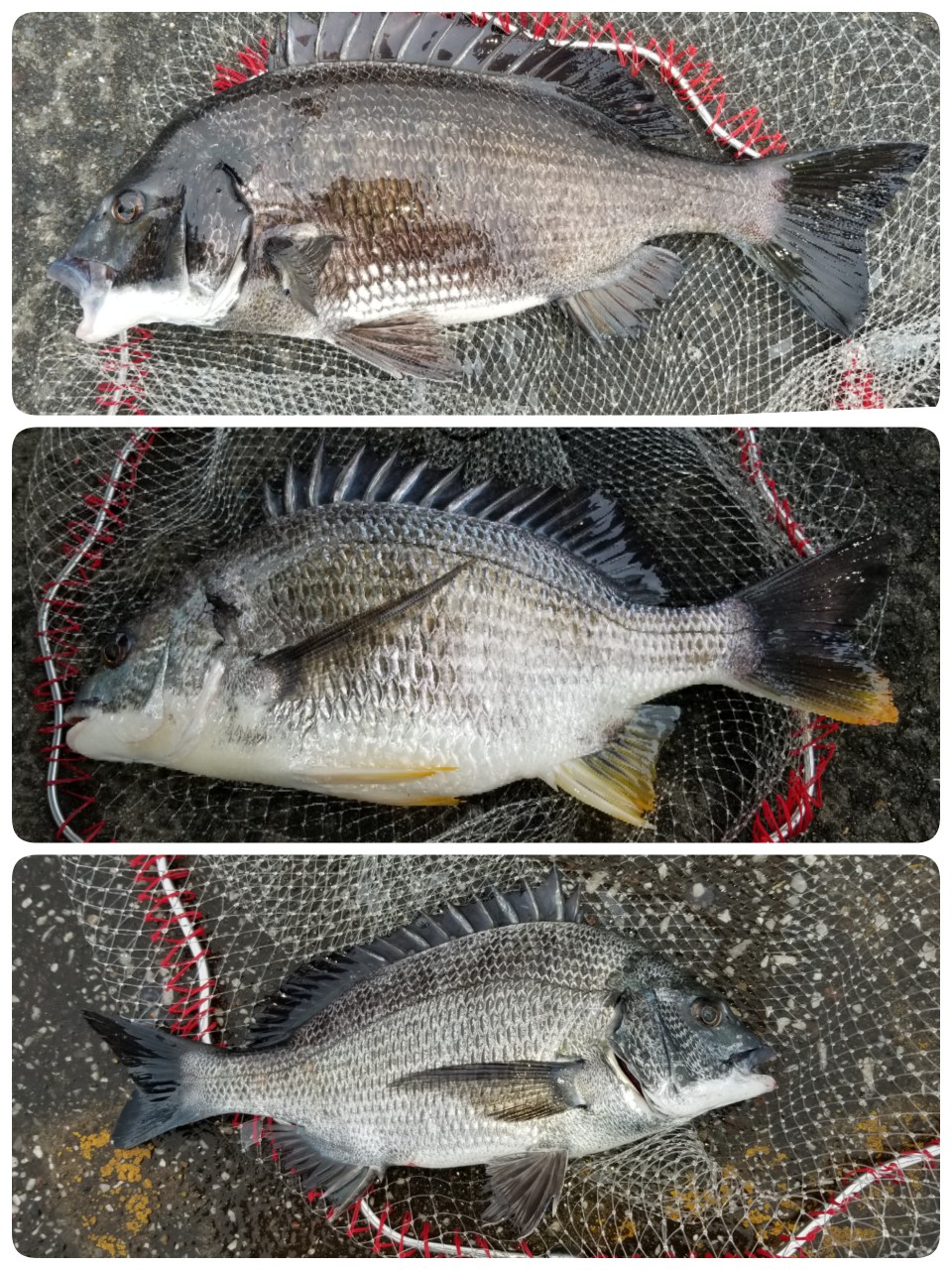 黒鯛家族さん、マサさん、今日はニコニコ☺️3枚釣れました、黒鯛47センチ、キビレ47センチ、最後は35センチのちびっこです。