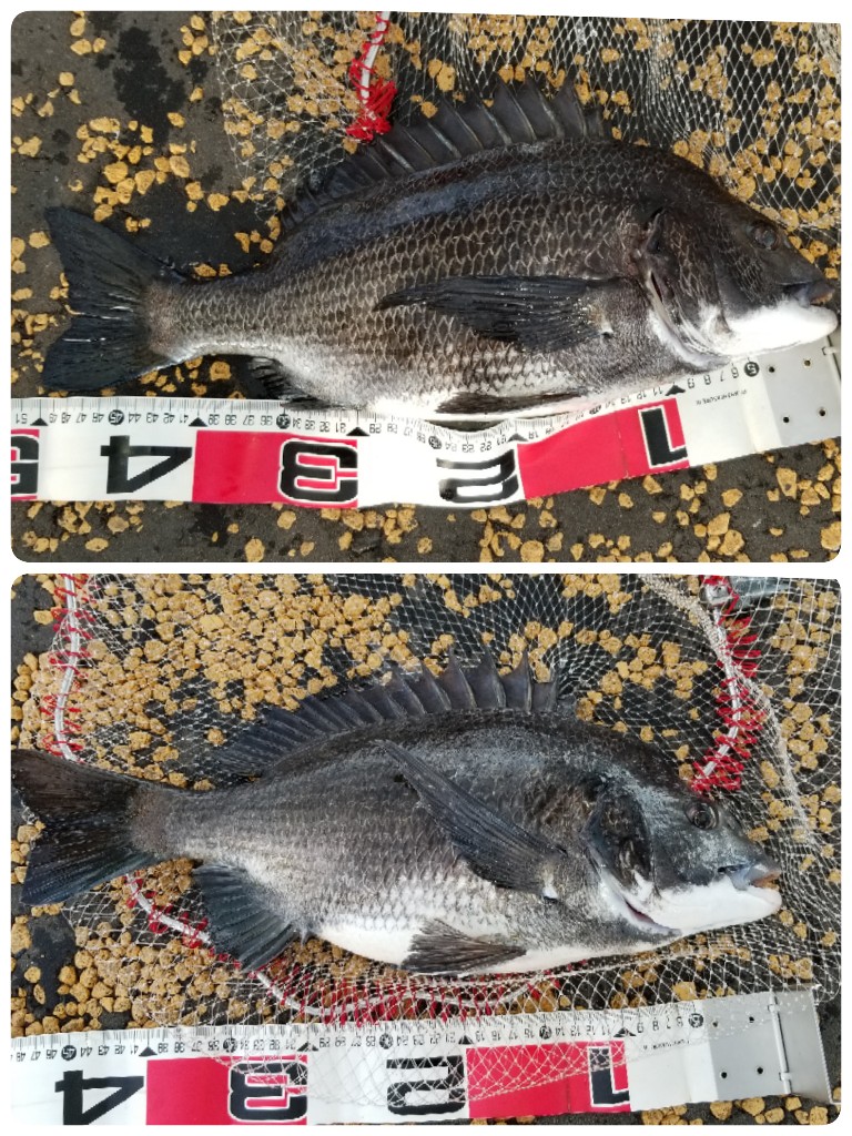 黒鯛家族さんマサ君、某所下の釣果です、黒ちゃんと仲良く二時間、食い渋るなかなんとか49センチ47センチゲットですよ。人が多くてダメだと思いましたよ。