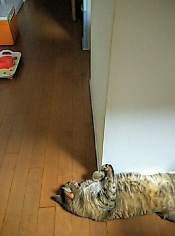 昼間は冷たいフローリング床が気持ちいいねぇ❗キナコメさんクーラーボックスの中が気になりますか(笑)