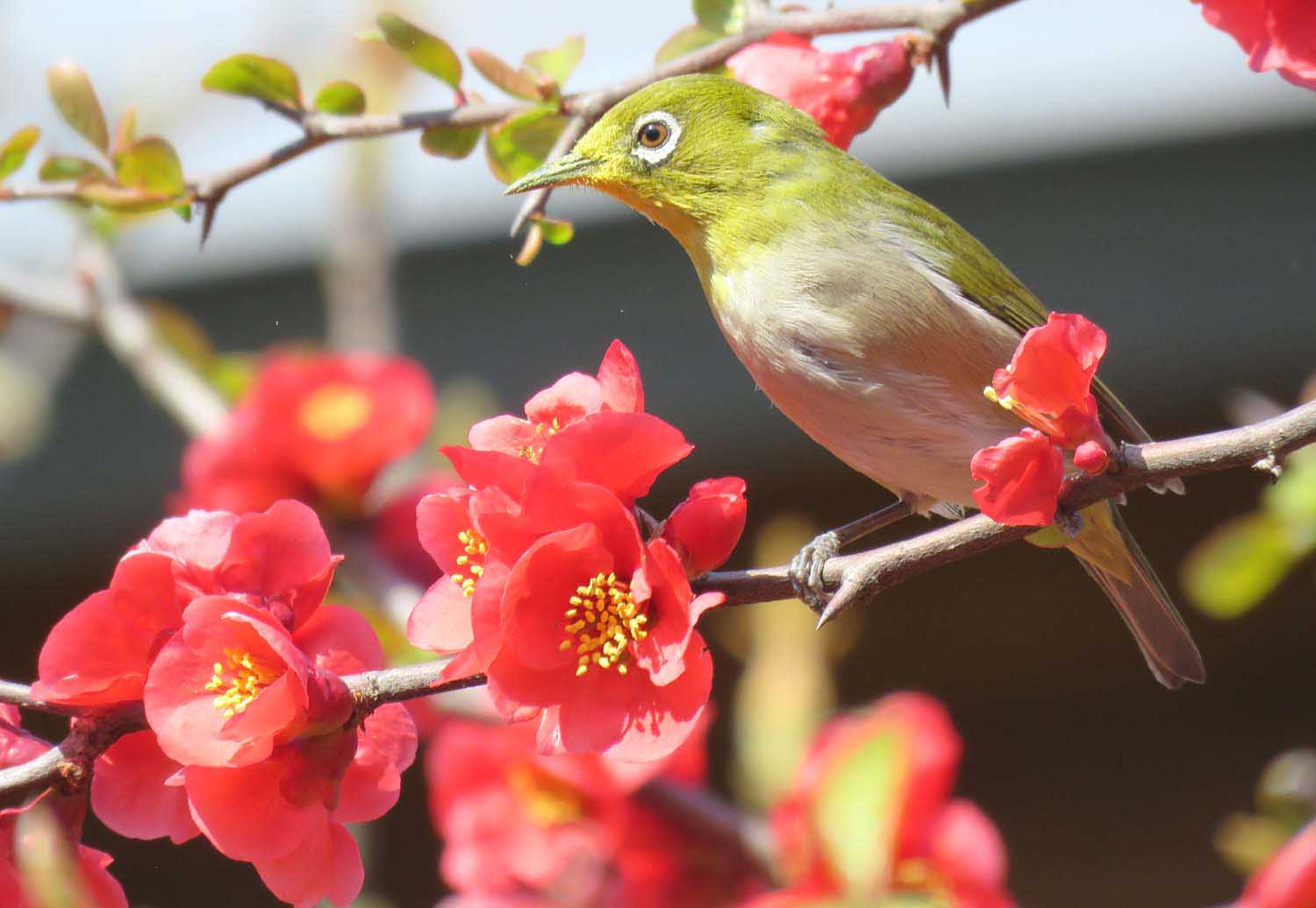 シトシト雨、天気予報を見ると気温が上がらず寒い一日と言う。麦酒がおいでおいで!と誘う!誘惑に負けた!マサ君、小さいながらも頑張る!ドジ君、明日は参戦予定!前回のメジロ君はカンヒ桜、今回は木瓜の中のメジロ君です。明日は何が撮れるかな?