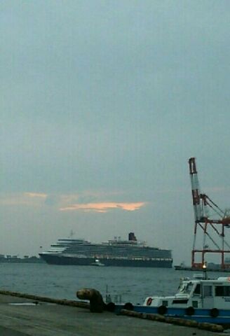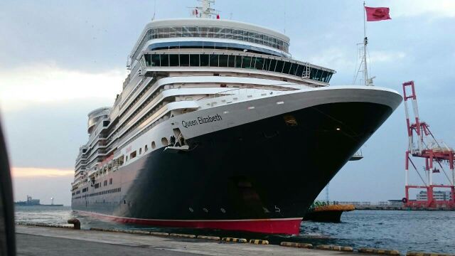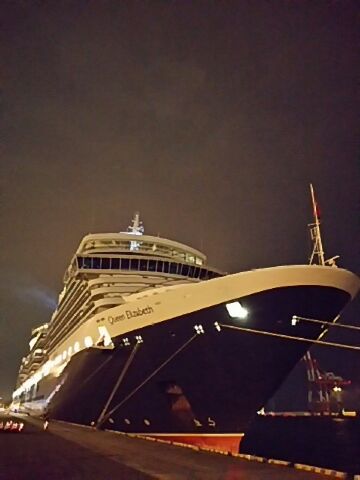 今回は大桟橋に着かずに貨物岸壁に入港したクィンエリザベス号❗可愛そうに(笑)