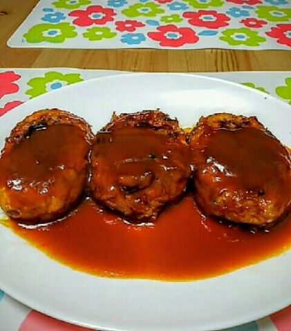 とりあえず煮込みハンバーグに調理したけど❗ソースに酒少々、レモン少々で酸っぱいソースに成った❗バター入れなかったのが敗因か