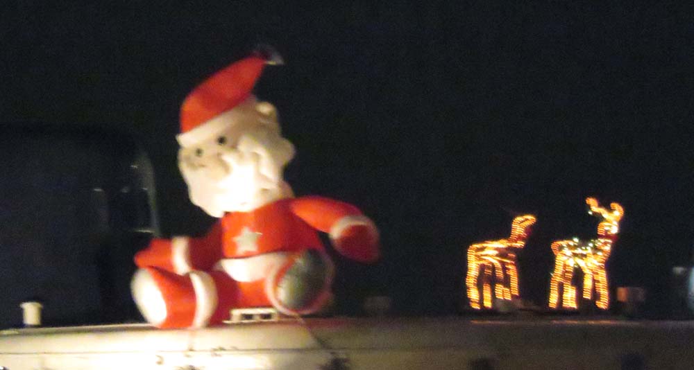 ♪ちんころべ〜ちんころべ〜!ちんころおんどっぺ〜♪幼い頃、良く歌いましたね!先日、ロイヤルウイングの上に何か有り、そして揺れている!何だろう?と思ってズームアップして見るとサンタさんでした。クリスマスには酒とケーキは付き物!しかし、キリストの誕生祝が有るのにイスラム教の祝いが無いのはどうしてだろうか?・・そうか・・イスラム教は酒禁止だからな!それで日本では受け入れられないのか!・・ガッテン!・・因みに、ドジ君、体調悪し、釣り休み・・・暖かい部屋で紹興酒を飲みながら、メリークリスマスです。