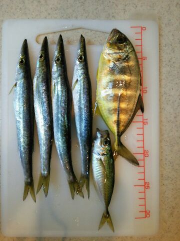 川奈港ヘ行くも木っ端だらけで夕方に投げサビキで小型のカマスを4匹キープして終了です🎵