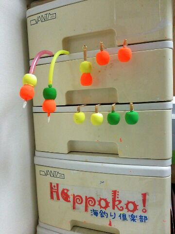 ドジ君は奴智鮫。鈴木君は鱸。めじなさんはメジナ!笛籠君は笛籠!ジャッキーリー君はドラゴンボール?マサ君はメロン君?目がクリクリして良いね!良い天気なのに今日はシマホで蛍光スプレーを1050-で買って来て早速、塗装です。昨日、羽根を飛ばしてしまい、ドジ君の酩酊の歩き方の如く、ふらふらと飛んで行く浮きを見て、駄目!コリャ・・高麗?(韓国では無い)塗料が乾いたら羽根作りに専念しよう!メジナさん 顔の塗料?(日焼け止め)は 取りましたか?その顔で飛行機に乗ったのでは?そりゃ無いな!無いな!