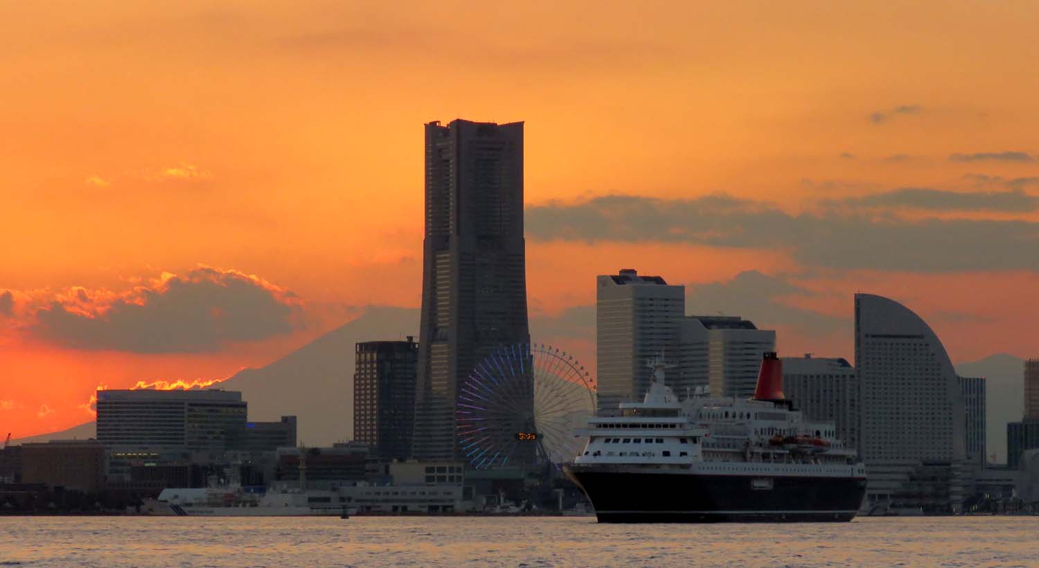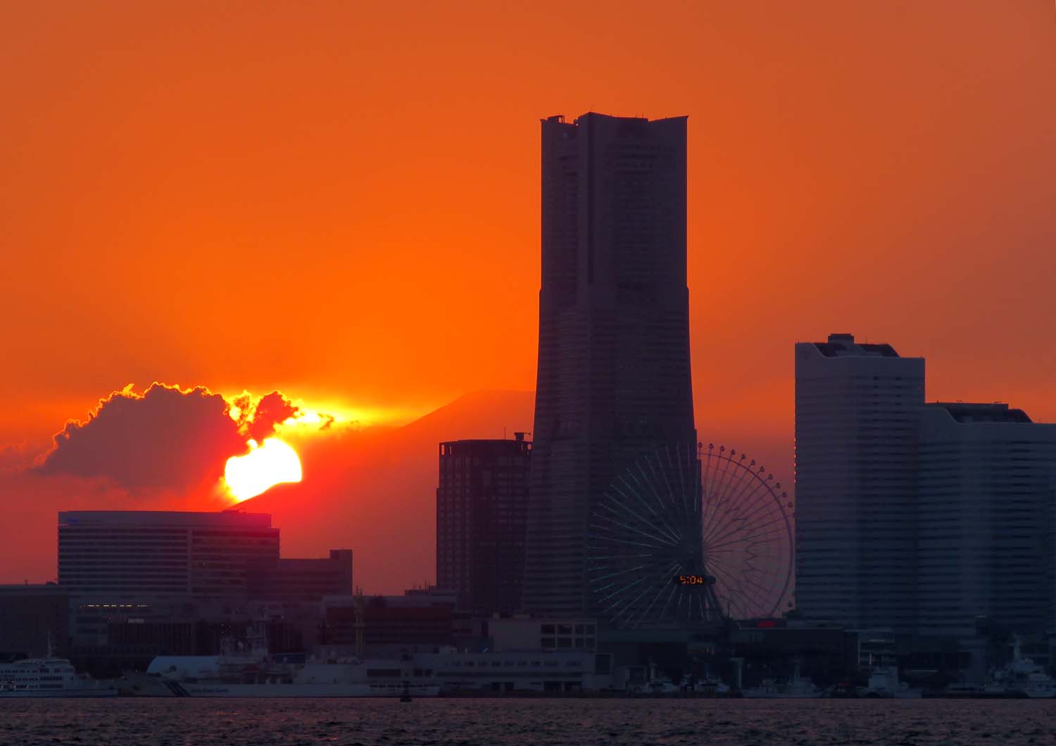 ドジ君、昨日の坊主のリベンジで今日は竿がシナル!しなる!メジナ 26?〜32?❹鯵20?❷海タナゴ25?➊計❼で9時終了!昨日の空母いずもは電飾(イルミネーション)で飾っていた。写真は数日前、富士山は宝永山に落ちる夕陽で有る。ダイヤモンド富士は直前に雲が掛かってカメラマンガッカリ!世の中、甘くあらへんで!と関西弁で言っとった!誰が?大黒だから大黒様やろ〜!