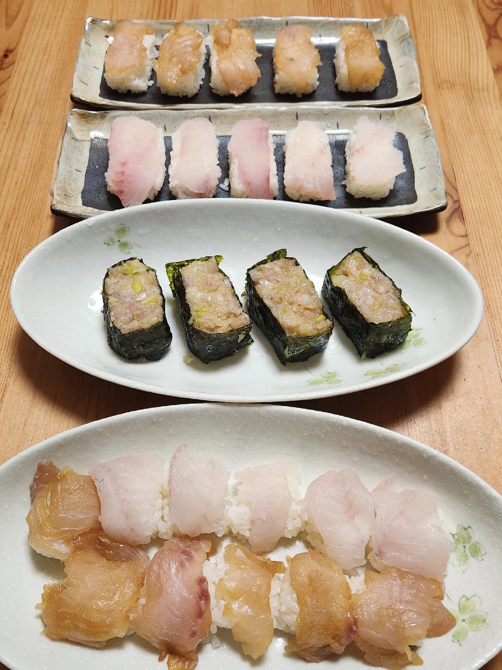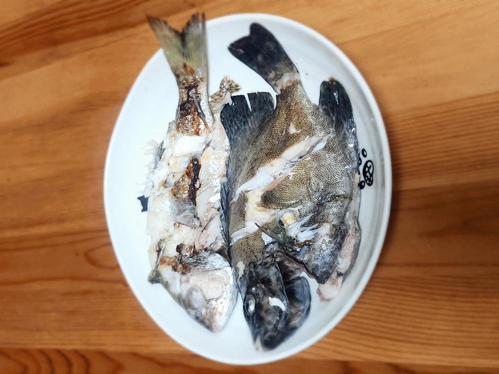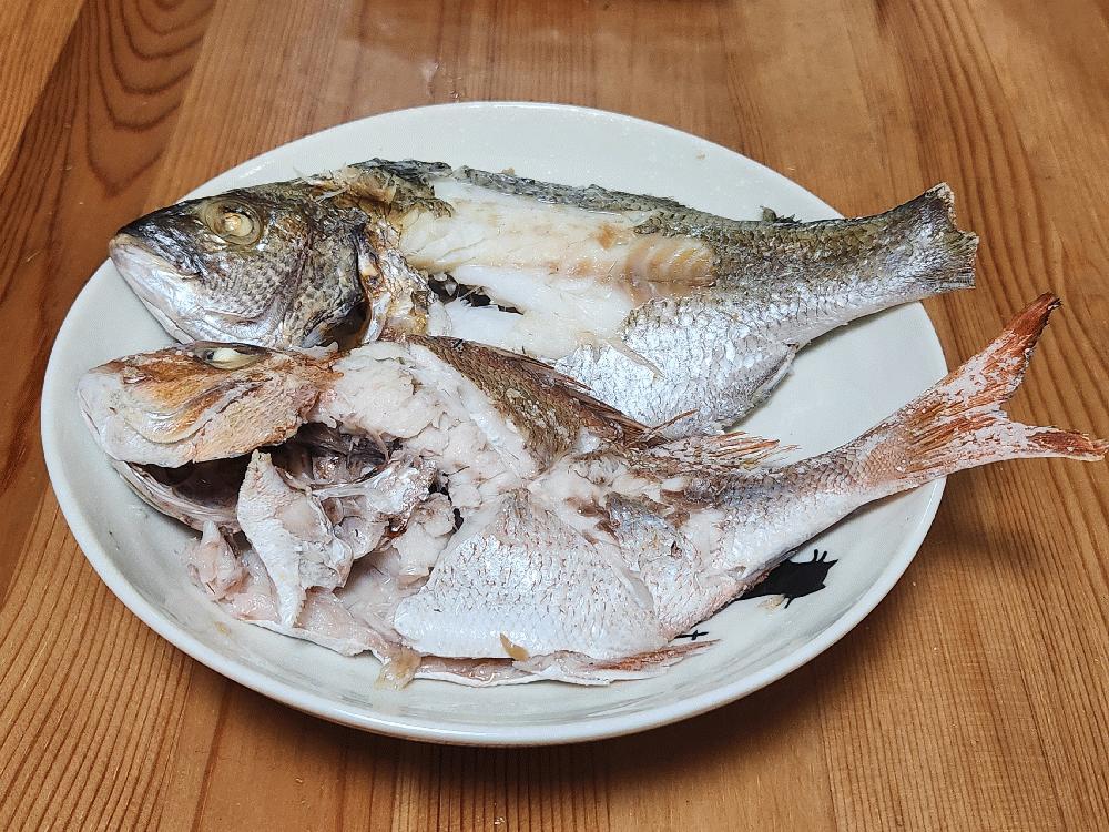 寝かせたクロダイと某所下で釣れた真鯛の塩焼き