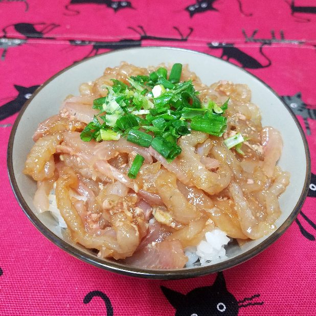 ネギ油、ゴマ油と合えてベラ、コノシロ、カワハギの細切り刺身丼