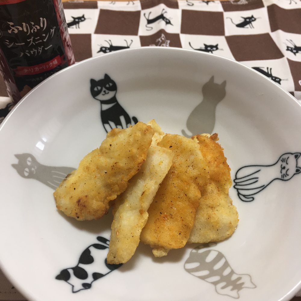 4.油を切ったらアツアツの内にボウルに揚げたカワハギを入れてお好みのシーズニングパウダーを入れて表面にまんべんなくまぶします。