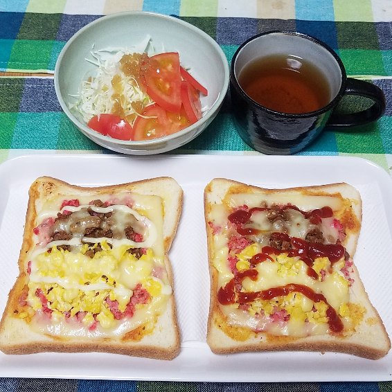 ピザペースト、バター、でんぷ、肉ソボロ、炒り玉子、チーズ
