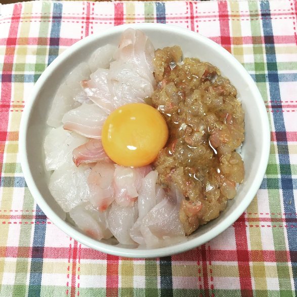 釣れたアジの漬けとクロダイの刺身でユッケ風丼です