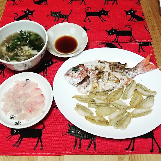 キスの仕掛けにマダイが釣れましたので刺身と塩焼きです😃旨い