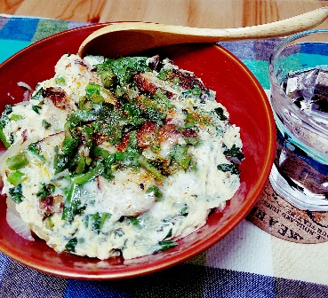 春菊の香りが苦手な方は他の有り合わせ野菜だけでも美味しいアジバーグ丼が