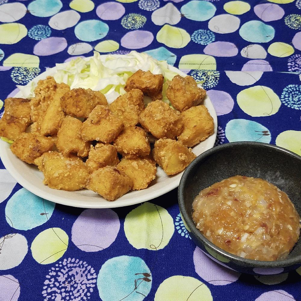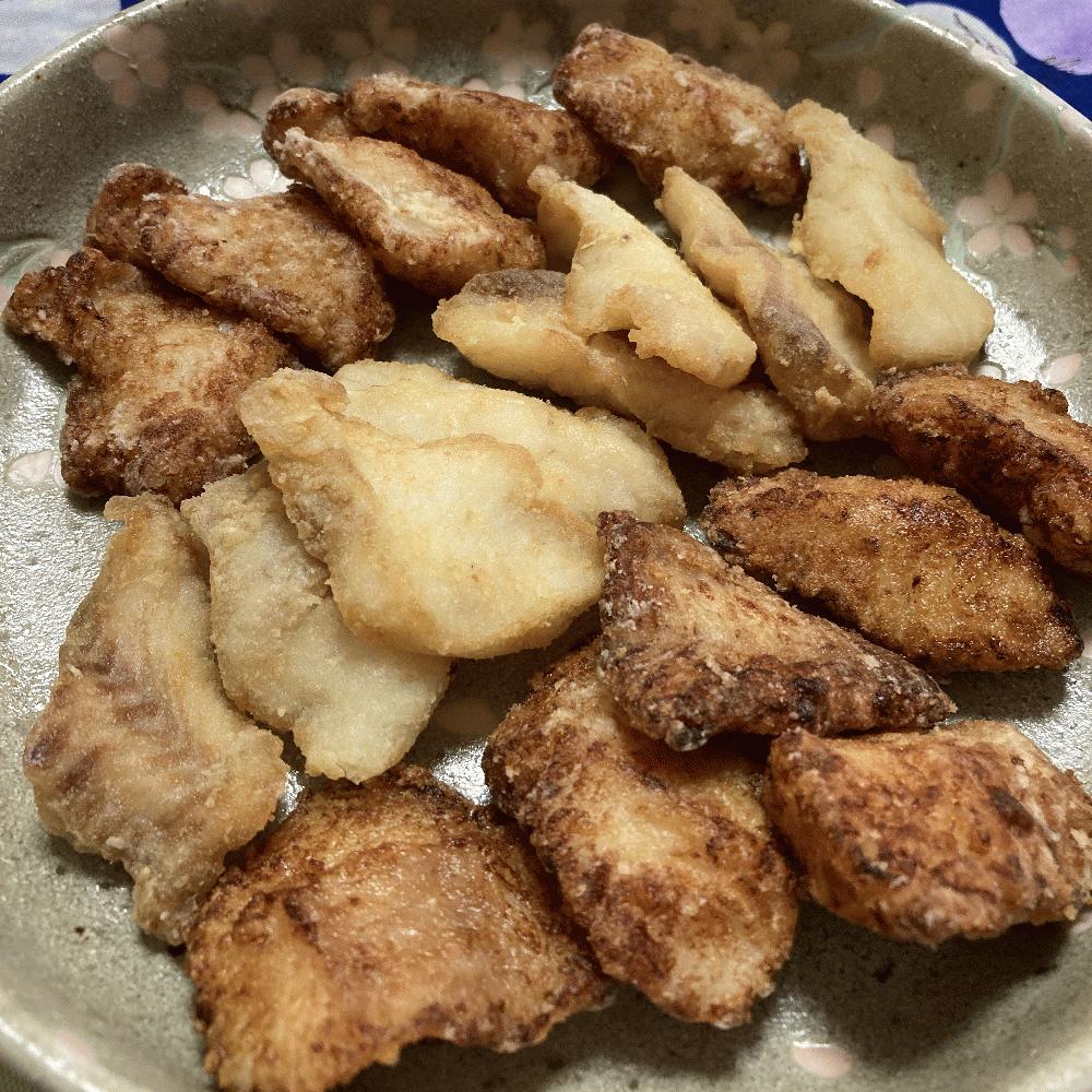実際に油で揚げてみると糀に漬かっている方は糖質の影響で焦げやすいのか着色がから揚げっぽくなります(謎)ので火加減に注意ですね。