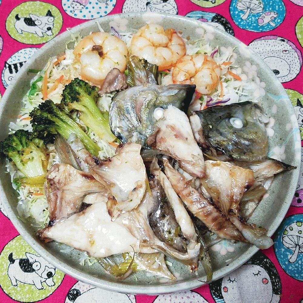 シマアジのハラス、中骨、カシラとエビ、野菜のアヒージョ