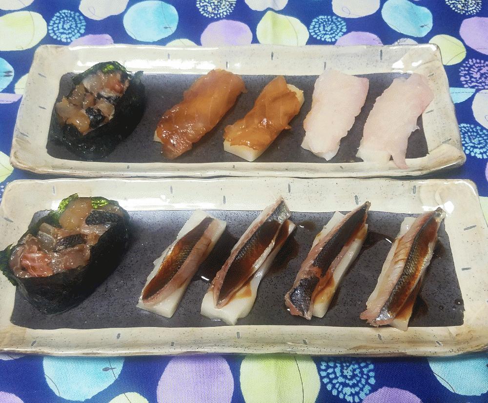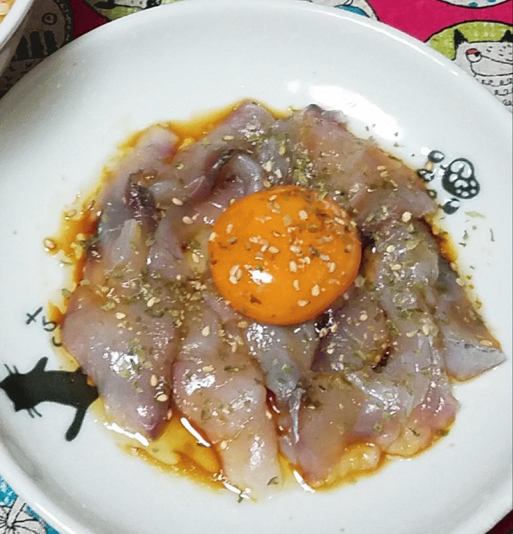 一晩寝かせたイスズミでユッケ風にゴマ油、醤油とイリゴマ、青のりで合えました