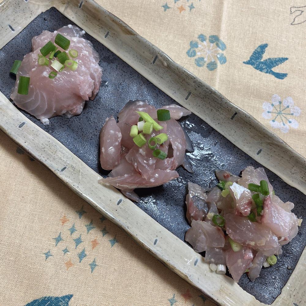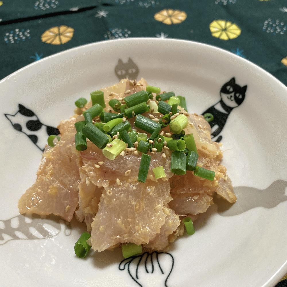 メジナをちょっとだけ薄く切り、それに生姜、ごま油、味噌を和えるだけ。