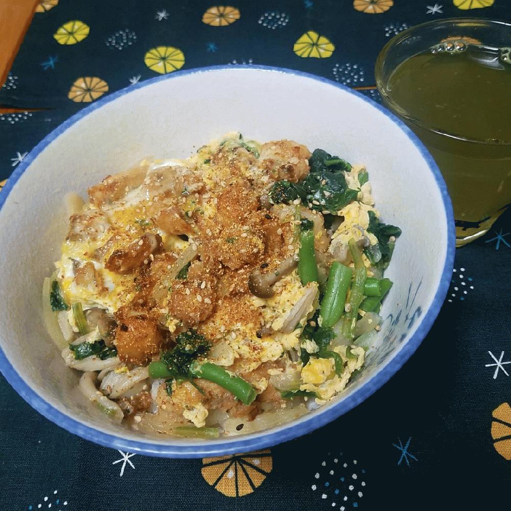 魚の竜田揚げを野菜と卵でとじて竜田揚げ丼