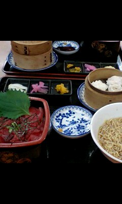 遅いお昼ご飯に、マグロ中落ち丼定食、何故かラーメンに小籠包付き、みんな好きなんでOKっす(爆)