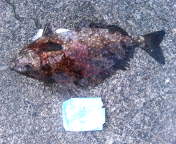 土日で社員旅行ついでに伊東で軽く釣りしてきました。小さな船着場でウキフカセでメジナ狙いだったのですが、フグの猛襲をうけて、オキアミがなくなりそうなときウキが一瞬で消えるようなアタリ!これはと思い合わせると、、、毒針番長(アイゴ)でした。グレじゃなくて残念だったけど引きは楽しめました!